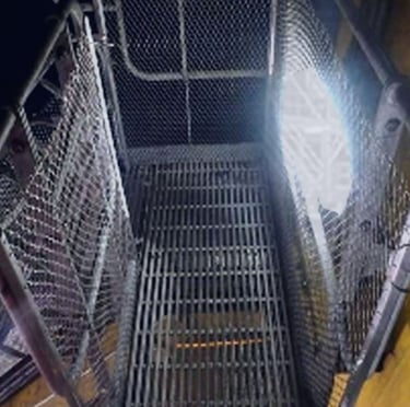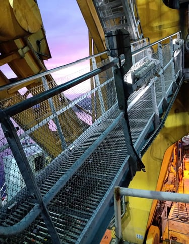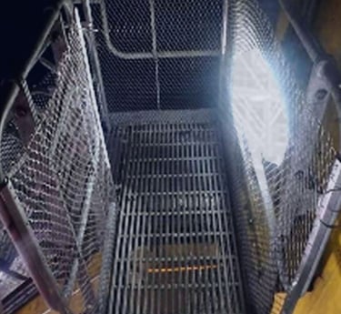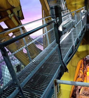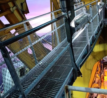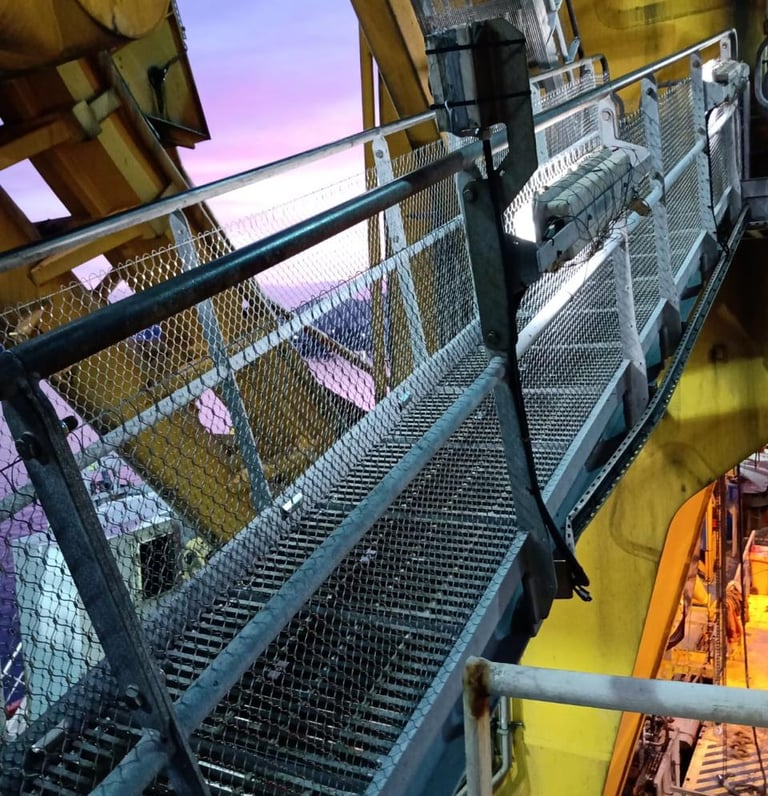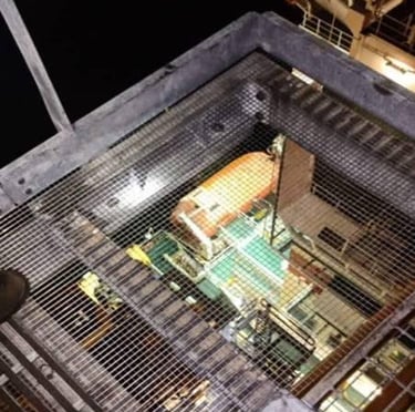 Instalação de telas de aço AISI 316 em guarda-corpos, corrimãos, pisos e escadas — criando uma barreira secundária que impede a queda de objetos soltos para níveis inferiores ou para o mar.
